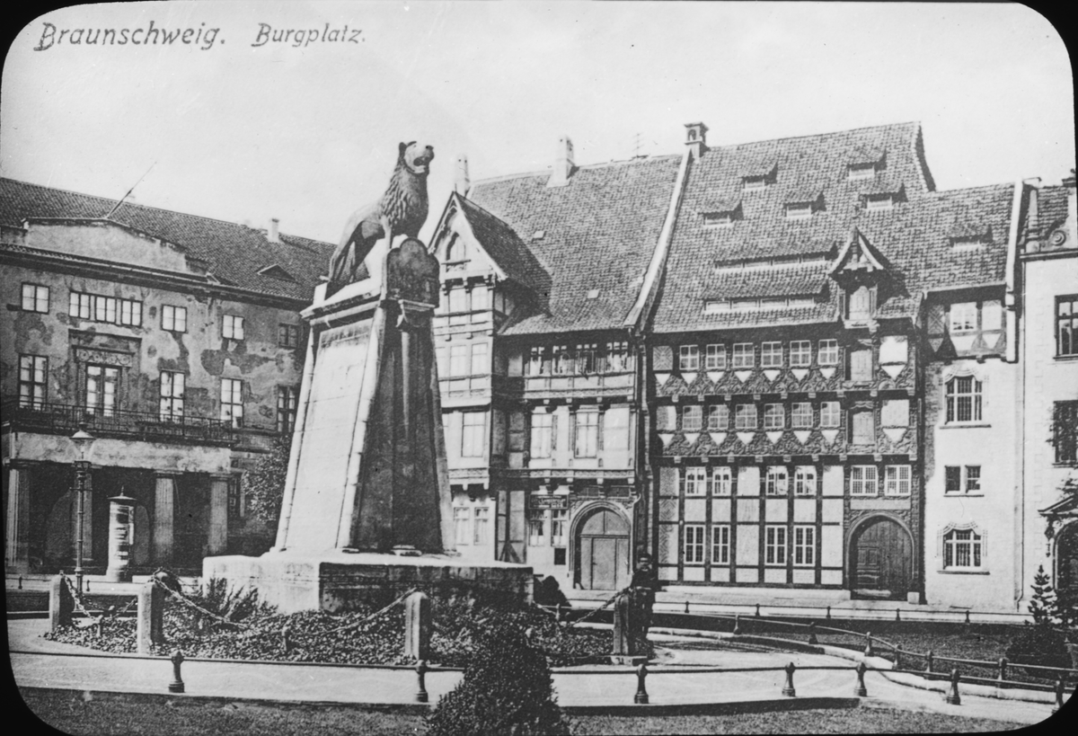 Skioptikonbild med motiv från Burgplatz i Braunschweig med monumentet Braunschweiger Löwe.