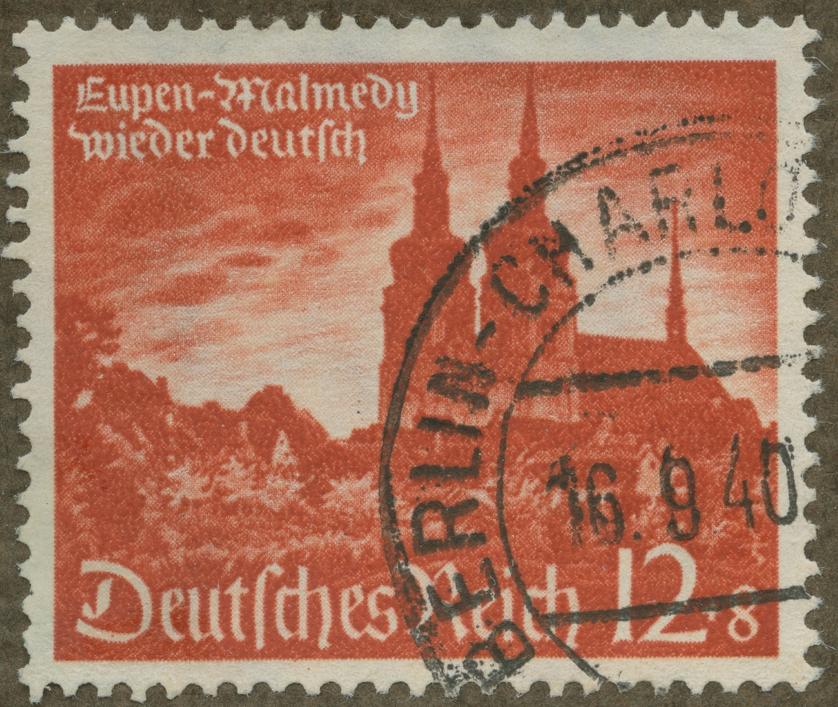 Frimärke från Tyskland, 1940. Motiv av Katedralen i Eupen-Malmedy. "Eupen-Malmedy wieder deutsch". "Minne av Eupen och Malmedys införlivning i Tyskland 1940".