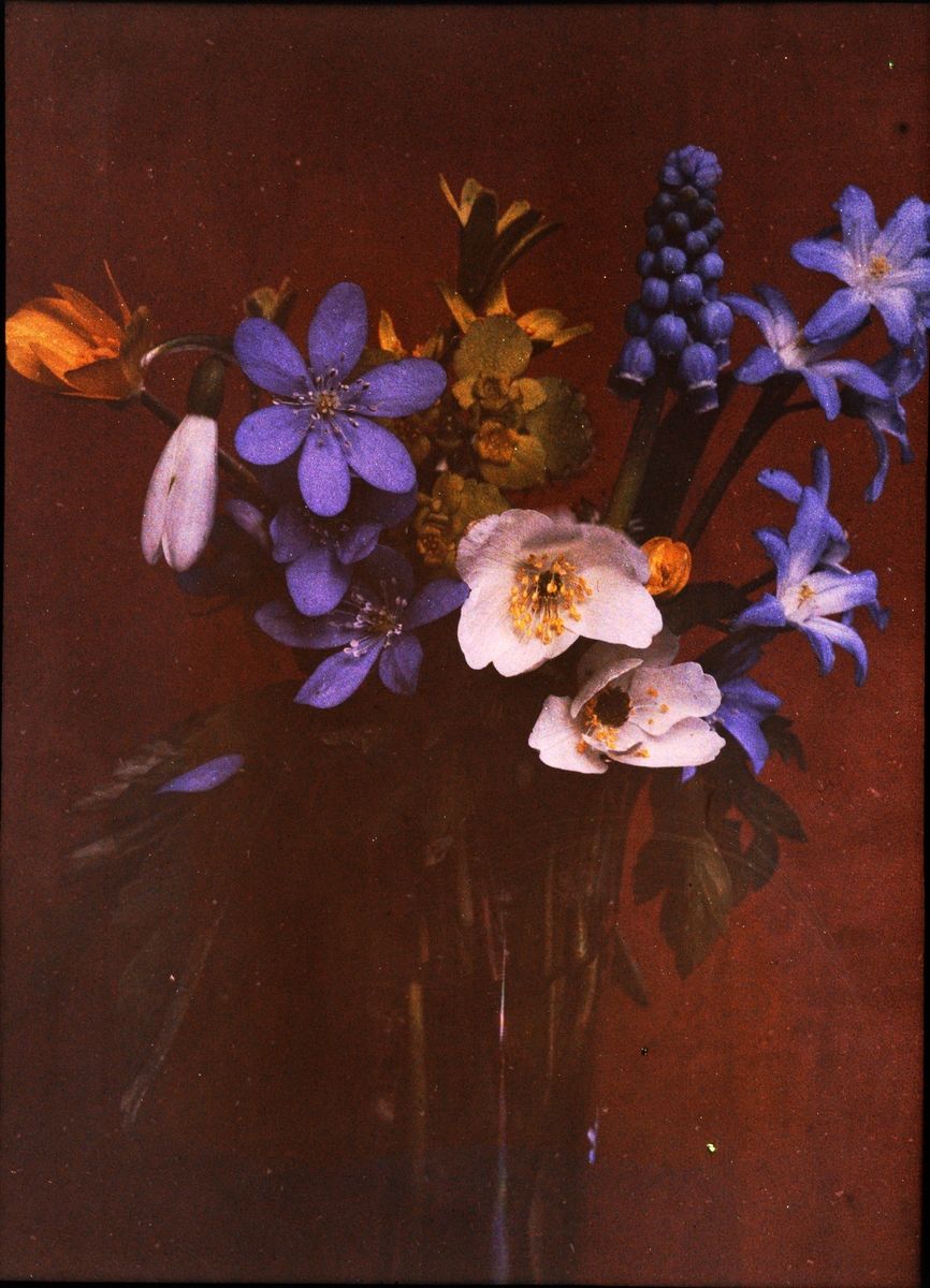 Lumières-autokrom. Blå och vitsippor m m. Görbersdorf Schlesien. Fotograferad i april 1910 f/48, 5 min. exponering.