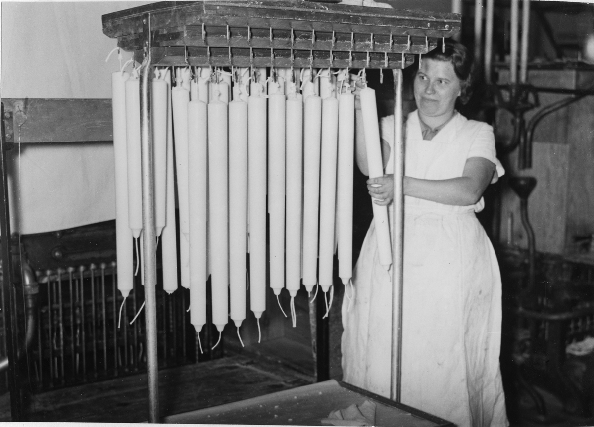 Liljeholmens Stearinfabrik. De största julljusen måste hängas upp då de ska poleras.