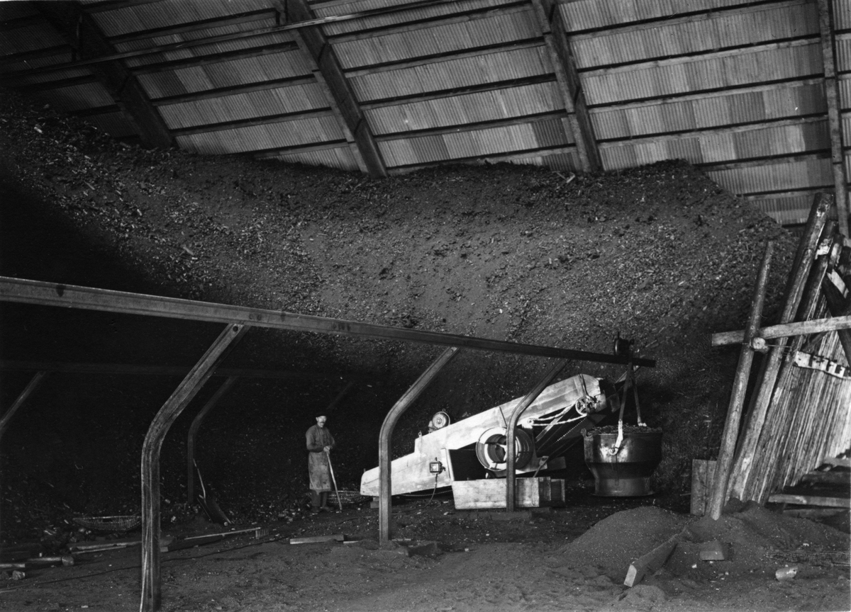 Hagfors bruk. Interiör från träkolhus med kolfatningsmaskin.
