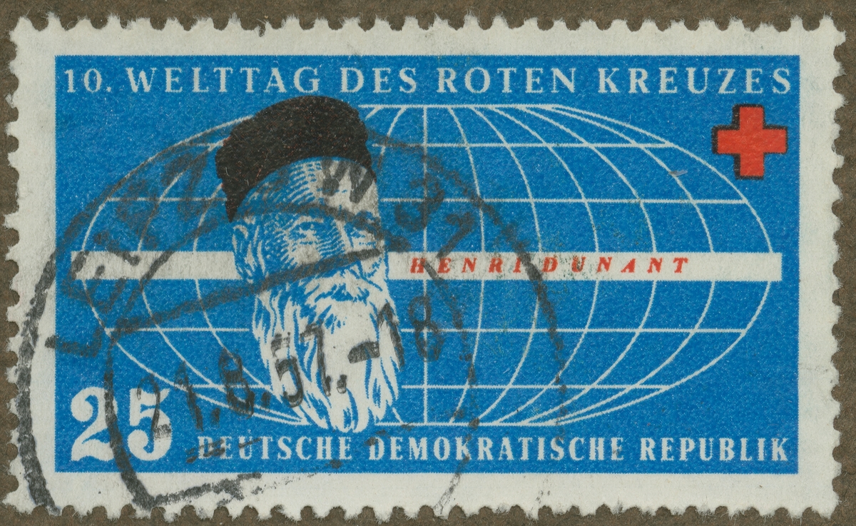 Frimärke från Östtyskland, 1957. Motiv av jordglob, Henri Dunant och Röda Korset. "Röda Korset 10:e världskongress".