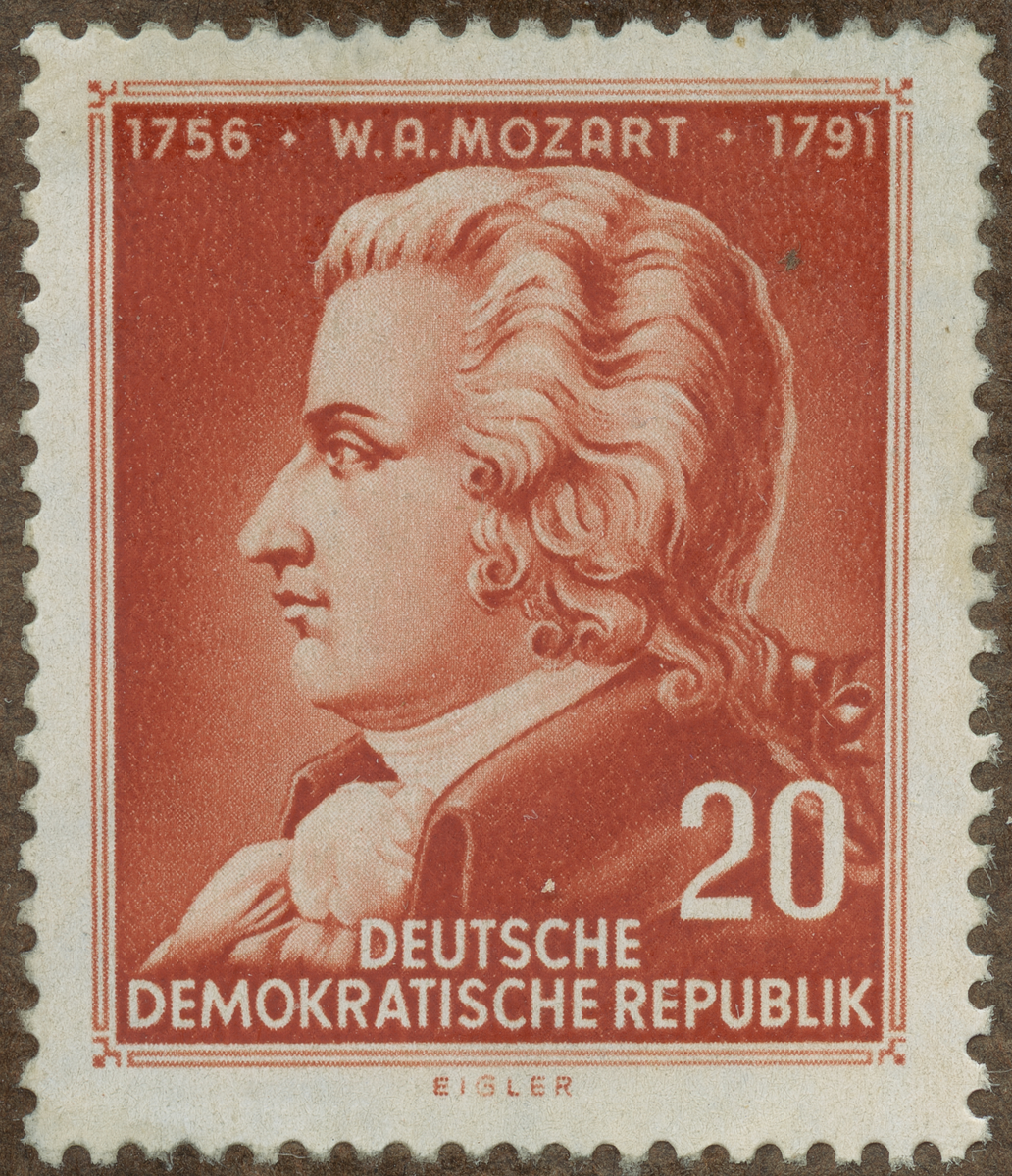 Frimärke från Östtyskland, 1956. Motiv av Wolfgang Amadeus Mozart: 1756-1791. Österr. kompositör. 200-årsminne av hans födelse: 1756-1956.