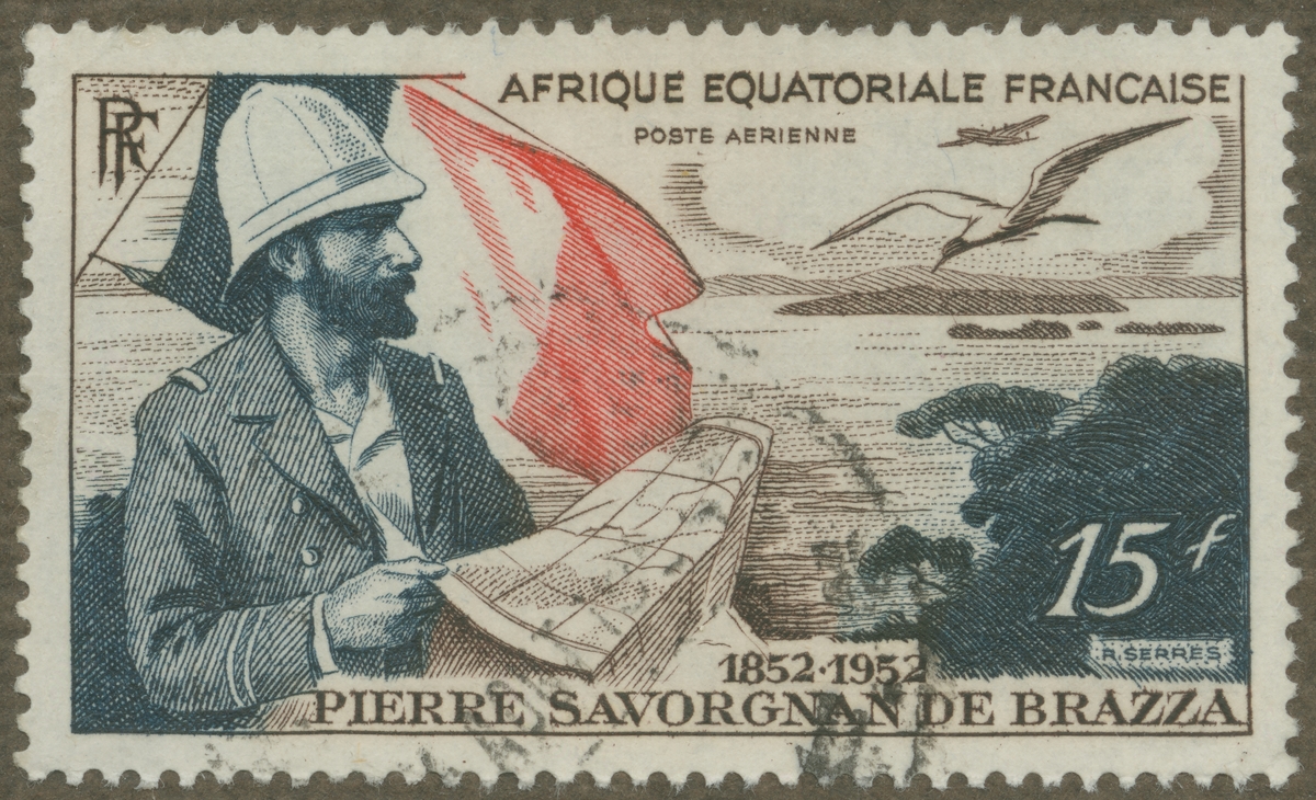 Frimärke från Fr. Ekvat. Afrika, 1951. Motiv av karta över Franska Ekvatorial Afrika. Upptäcksresanden Pierre Savaorgnan de Brazza: 1852-1952. "100-årsminne av hans födelse".