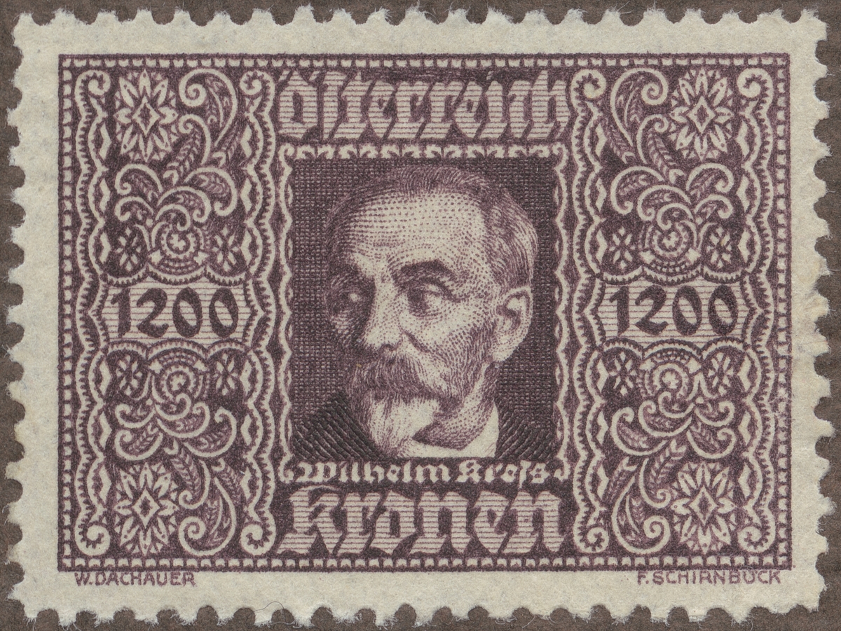 Frimärke från Österrike, 1918. Motiv av Wilhelm Kress: 1836-1913. Österrikisk pionjär inom flygtekniken. Systemet tyngre än luften.