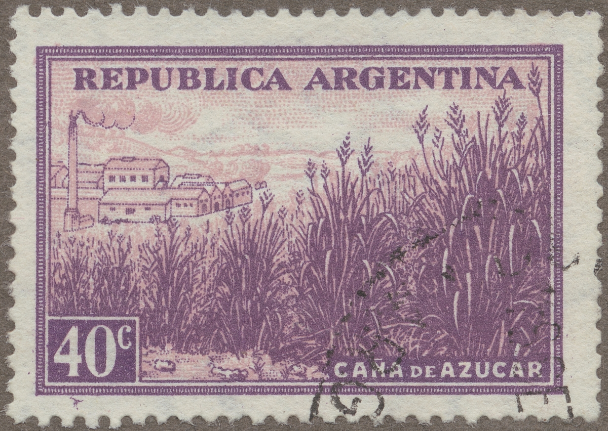 Frimärke från Argentina, 1935. Motiv av sockerrörsplantage. Sockerbruk i bakgrunden.