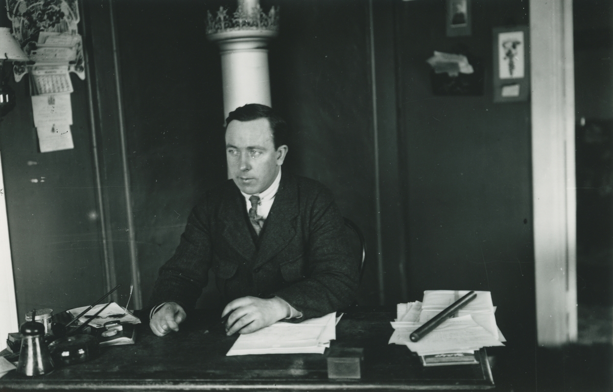 Bild från expedition i Antarktisområdet. Motiv av Edward Binnie vid ett skrivbord.
