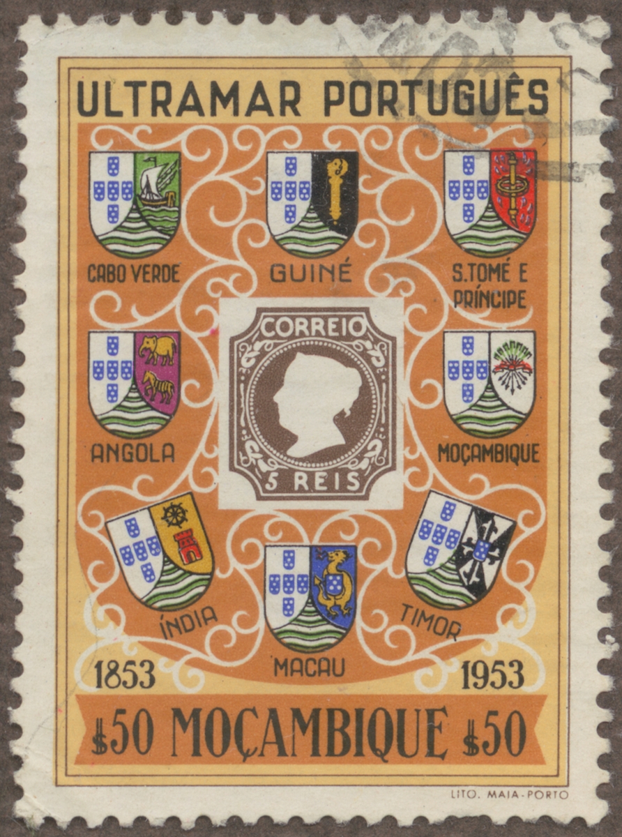 Frimärke från Mozambique, 1953. Motiv av Portugisiska koloniers vapen Filiateliexposition 1954 "Frimärkena 100 år: 1853-1953."