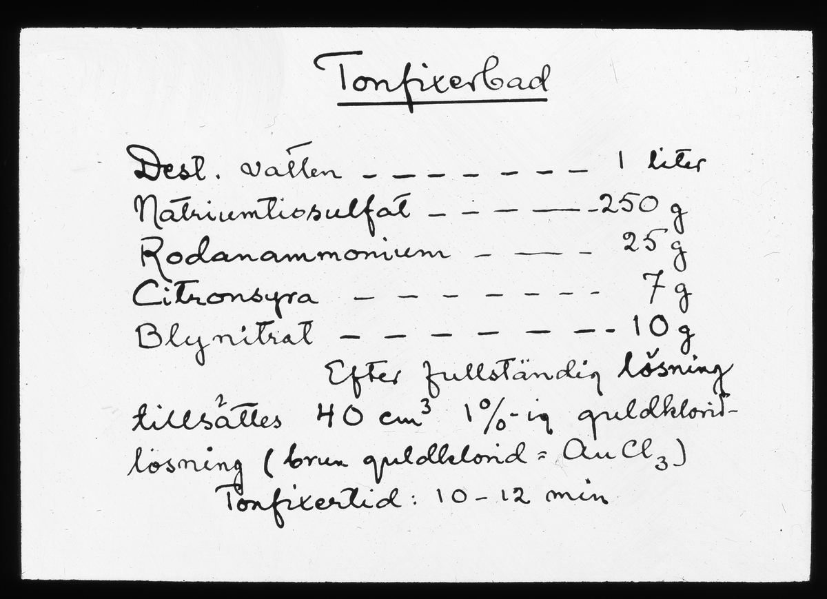 Skioptikonbild från Institutionen för fotografi vid Kungliga Tekniska Högskolan. Använd av professor Helmer Bäckström som föreläsningsmaterial. Bäckström var Sveriges första professor i fotografi vid Kungliga Tekniska Högskolan i Stockholm 1948-1958.