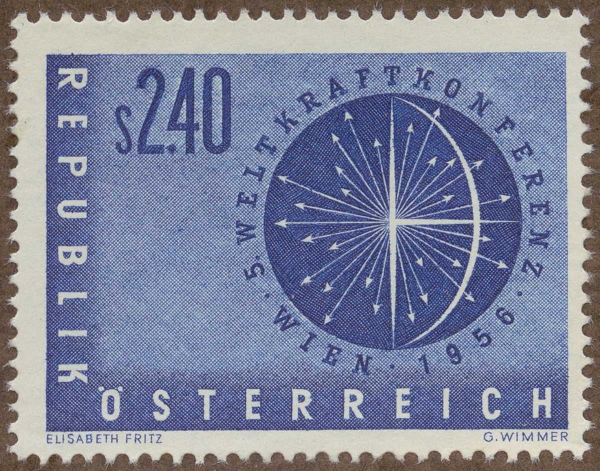Frimärke ur Gösta Bodmans filatelistiska motivsamling, påbörjad 1950. Frimärke från Österrike, 1956. Motiv av Symbolisk bild: Energicentrum "-5. Världskraftkonferensen i Wien 1956.-"