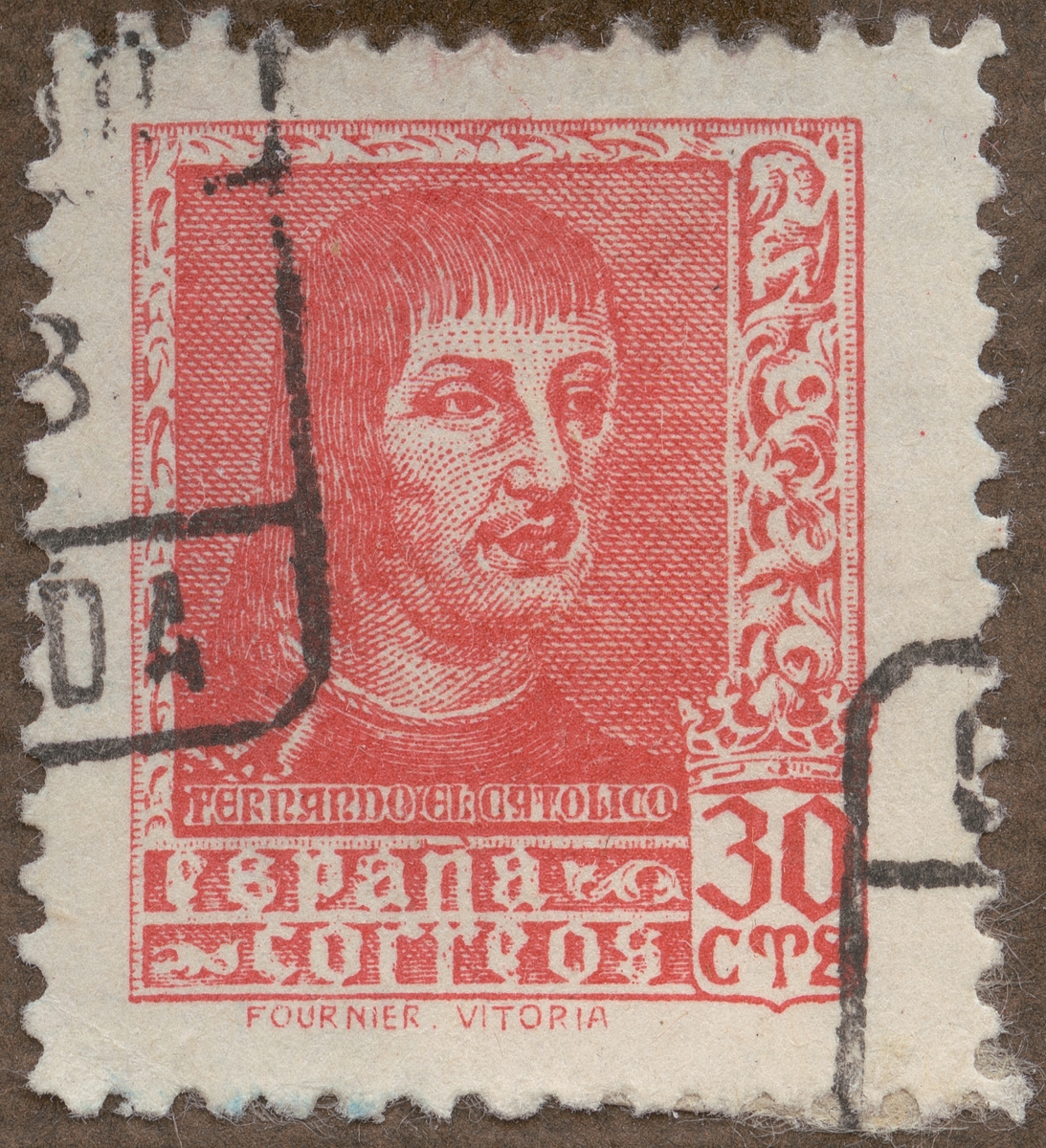Frimärke från Spanien, 1938. Motiv av Ferdinand Catholicus 1452-1516 Kung i Spanien Understödde Columbus:s resor.