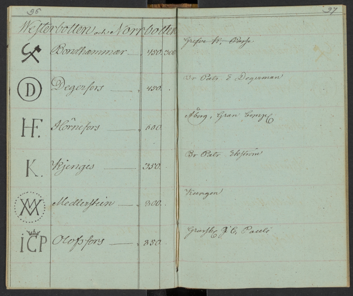 Svenska Stångjärns- och manufakturverkens smidesrätt, stämplar och ägare år 1832.