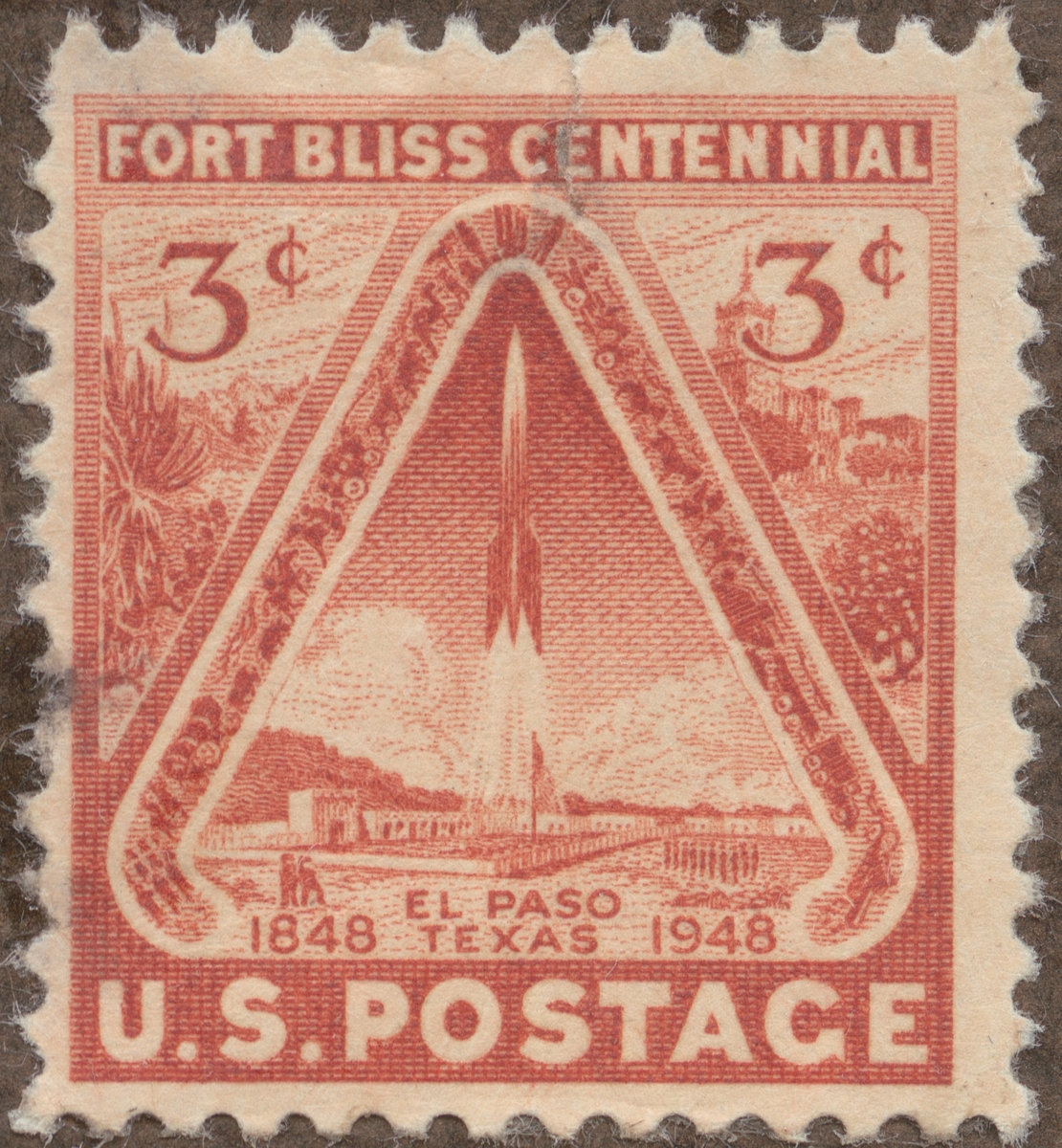 Frimärke från U.S.A., 1948. Motiv av Raketbomb över Fort Bliss, El Paso, Texas "Fort Bliss 100 år 1848-1948"