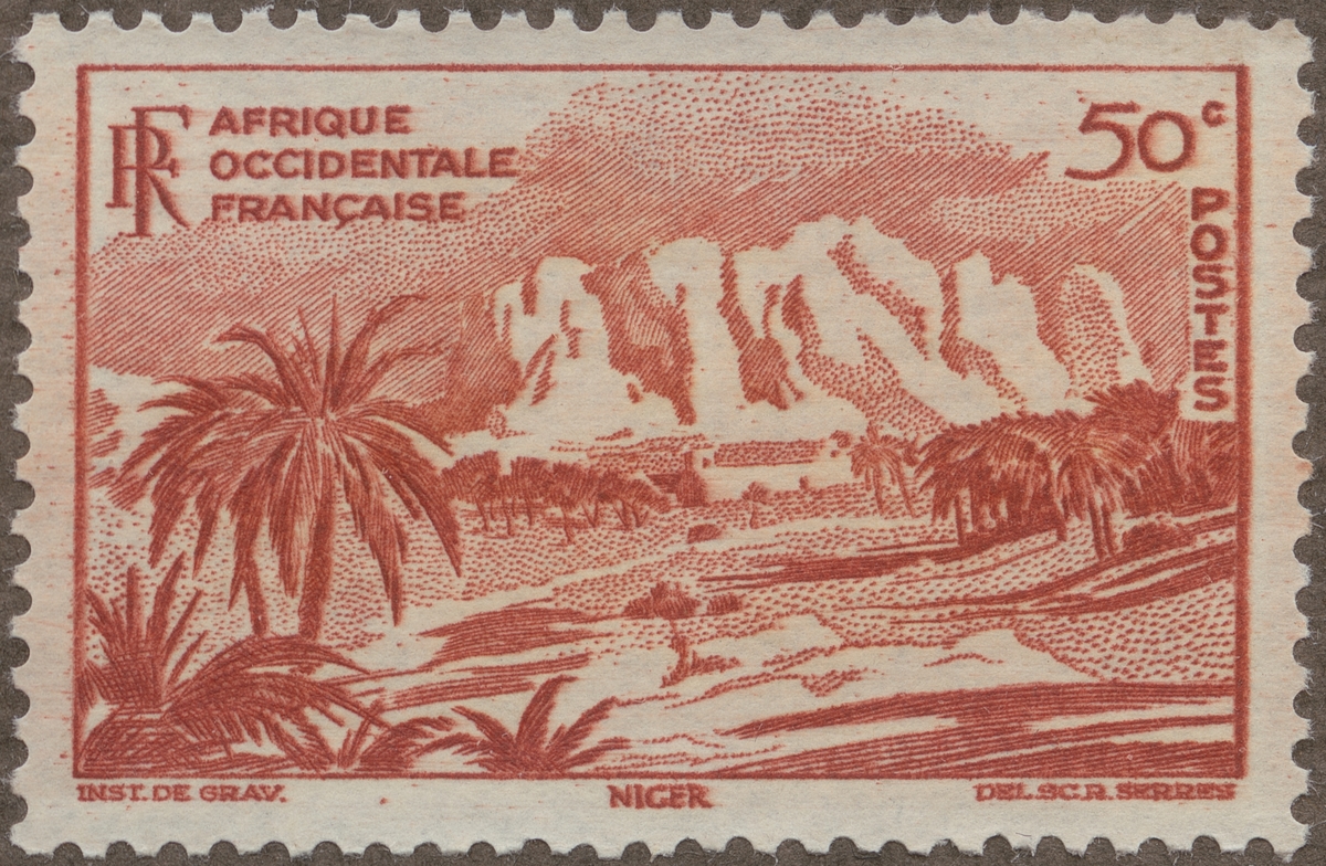 Frimärke från Franska Västafrika, 1945. Motiv av kokospalmer vid Nigern. "Bilma Oas".