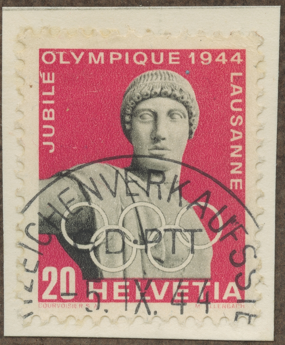 Frimärke från Schweiz, 1944. Motiv av Idrottsman med Olympia-Ringar 1944