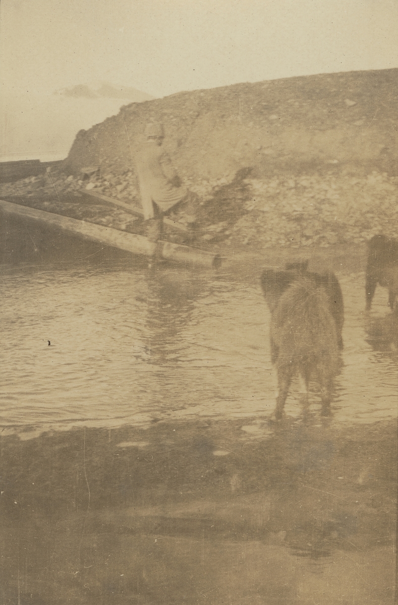 Fotografi från expedition till Spetsbergen. Motiv av man och hundar vid vattendrag.