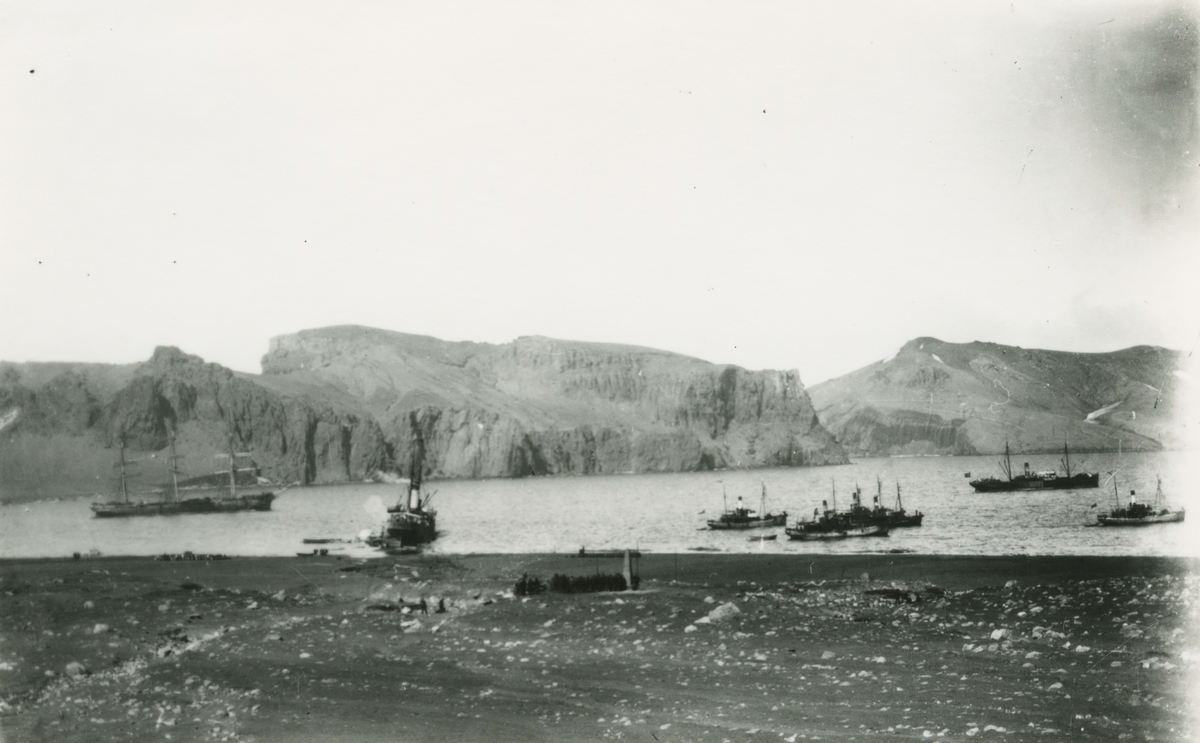 Bild från expedition i Antarktisområdet. Båtar i vattnet vid Deception Island.