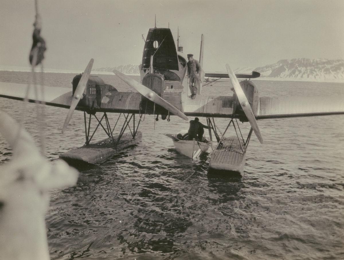 Fotografi från svenska undsättningsexpeditionen 1928. Motiv av flygbåten "Uppland" i havet vid Spetsbergen.