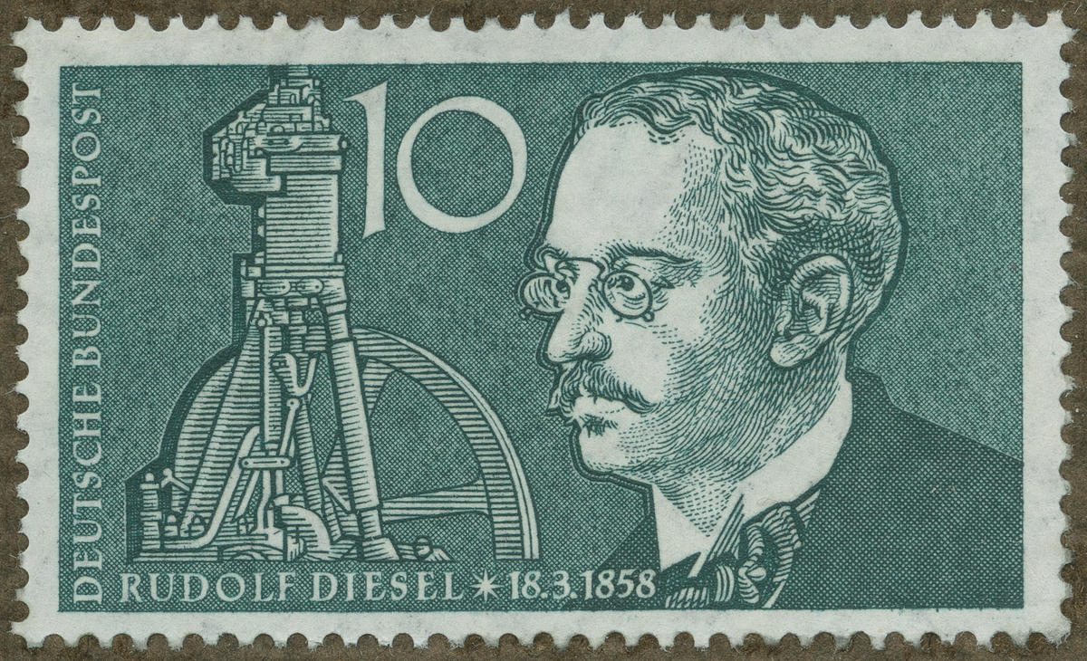 Frimärke från Väst Tyskland, 1958. Motiv av Rudolf Diesel 1958-1913 Förbränningsmotorn 100-årsminne av födelse 1858-1958.