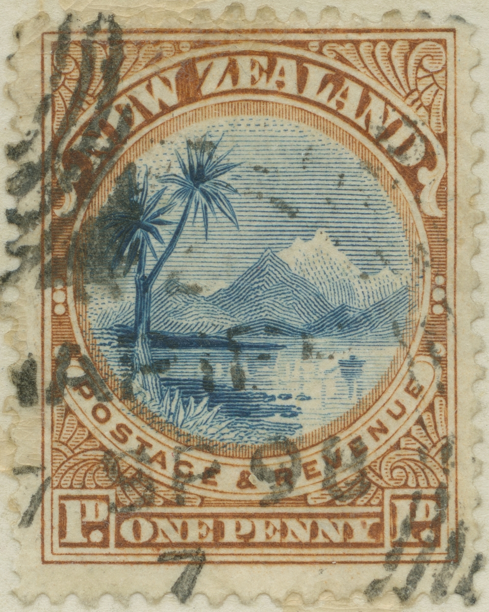Frimärke ur Gösta Bodmans filatelistiska motivsamling, påbörjad 1950. Frimärke från New Zealand, 1898. Motiv av Sjön Taupo Berget Ruapehu