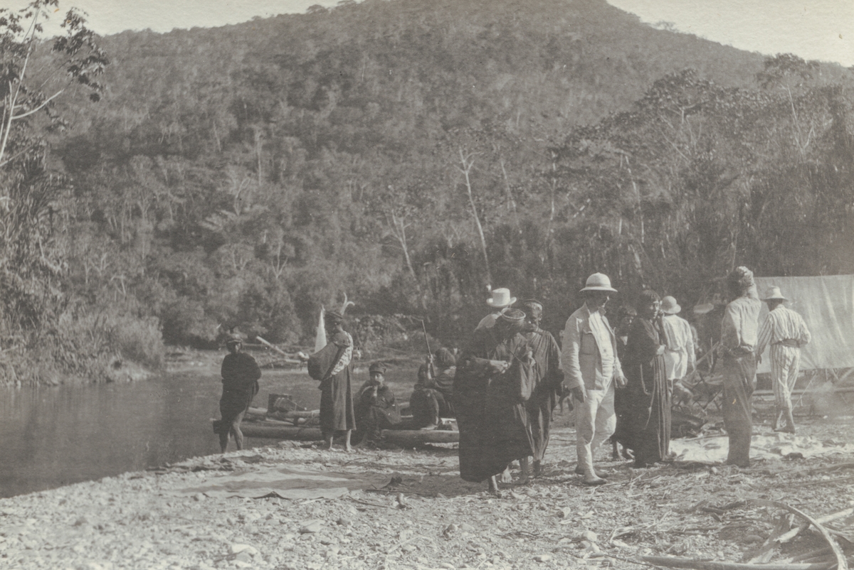 Fotografi från kuvert märkt med "Ernst Nordenskjöld". Motiv av expeditionsdeltagare vid tältläger i djungeln.