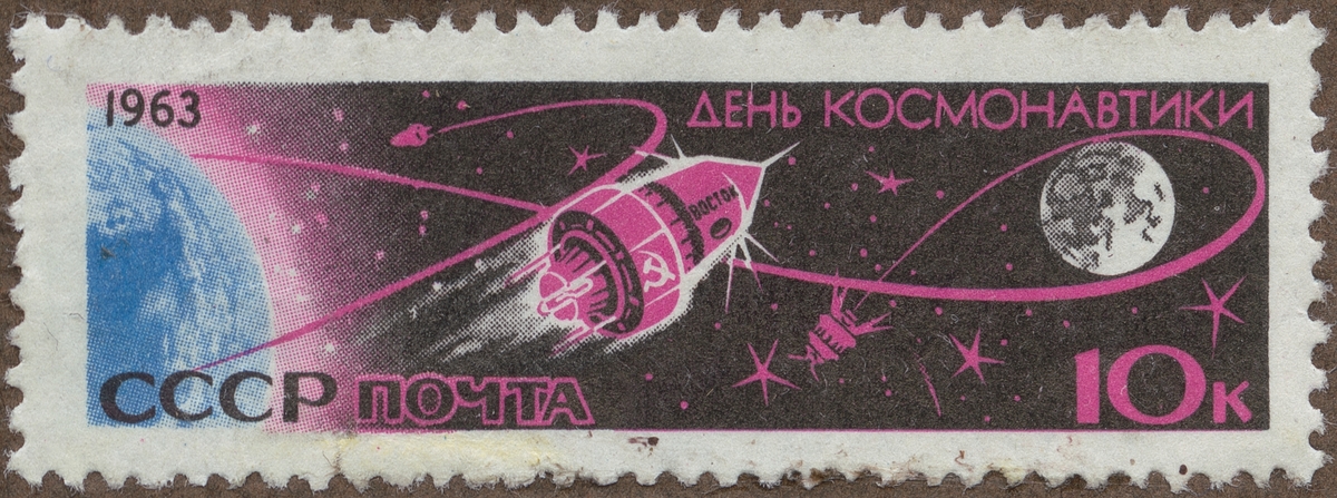 Frimärke från Ryssland, 1963. Motiv av Rymdskeppet Wostok emellan jorden och månen. "-Astronaut Dag-"