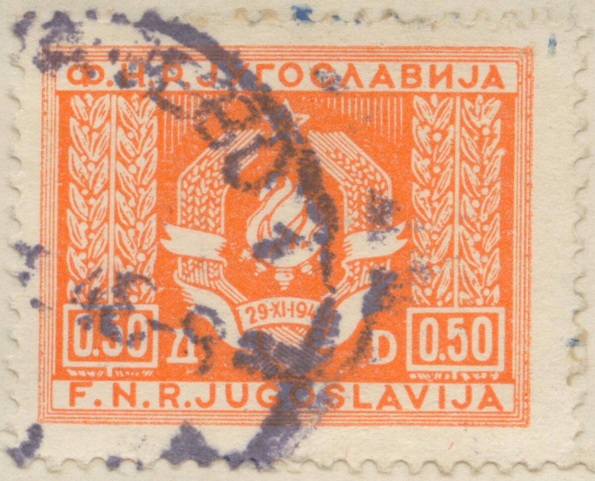 Frimärke från Jugoslavien, 1946. Motiv av Stiliserat Vapen Fackla. Sädesax- -Symbol för jugoslaviska Folkrepubliken-