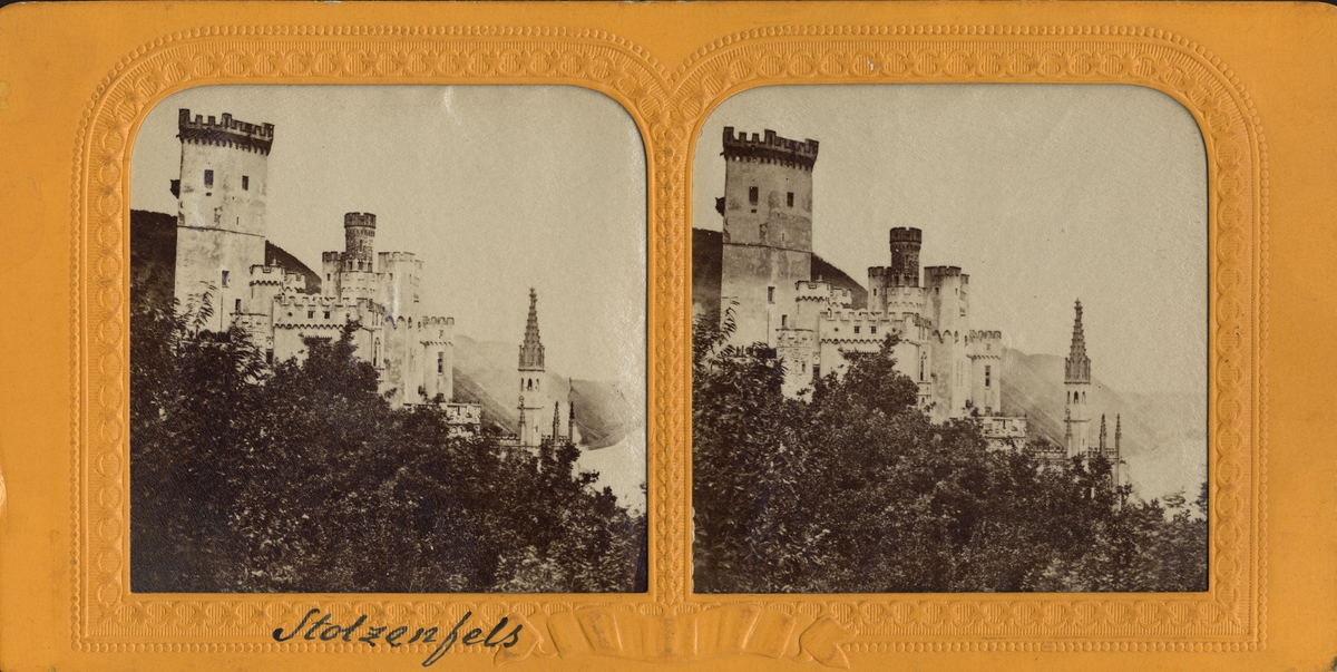 Stereobild av slottet Stolzenfels vid stranden av Rhen.