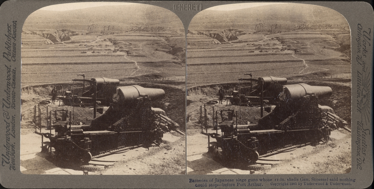 Stereobild av Japanska belägrings vapen, kanoner, i närheten av Port Arthur.