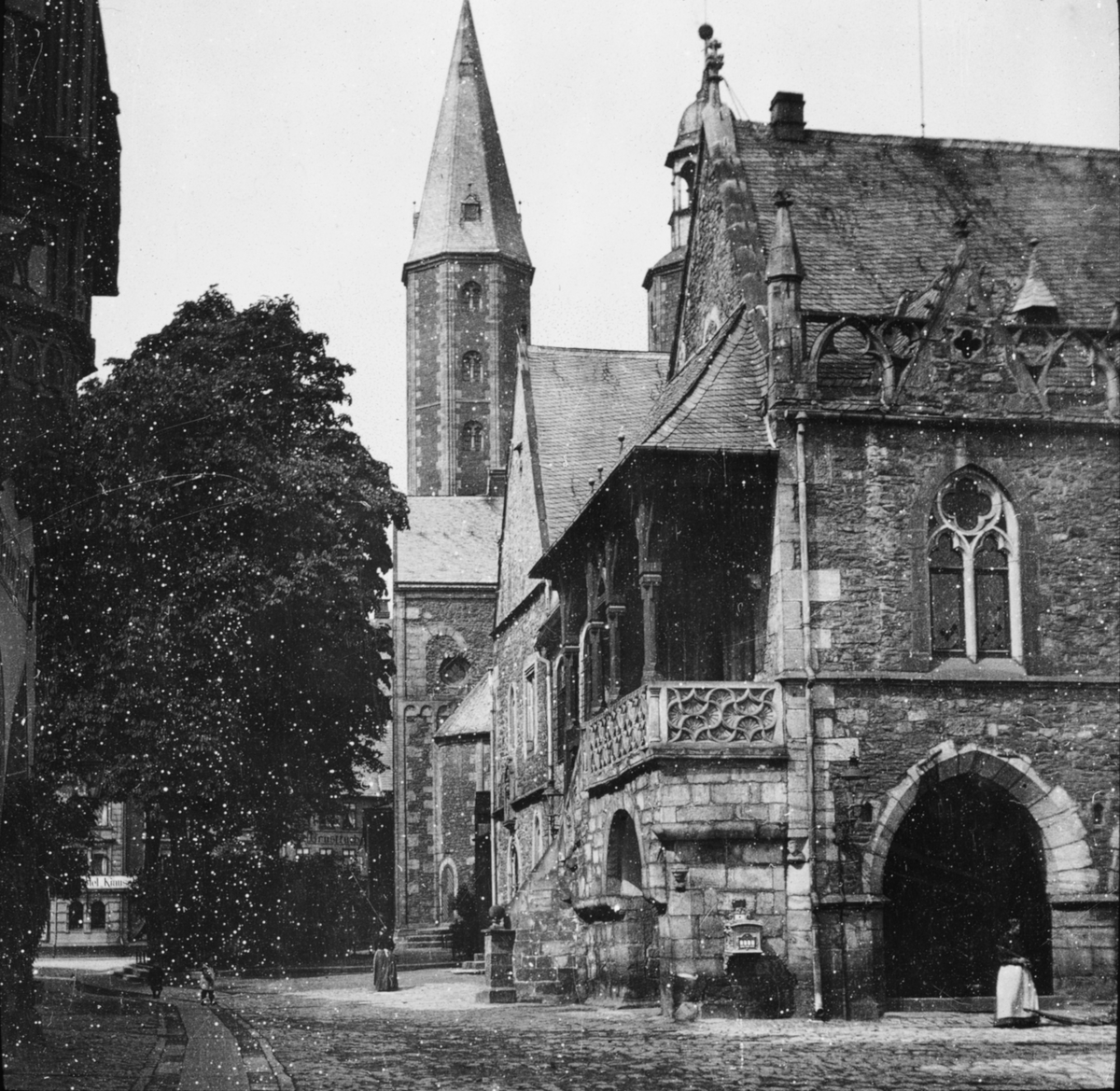 Skioptikonbild med motiv av rådhuset vid torget i Goslar.