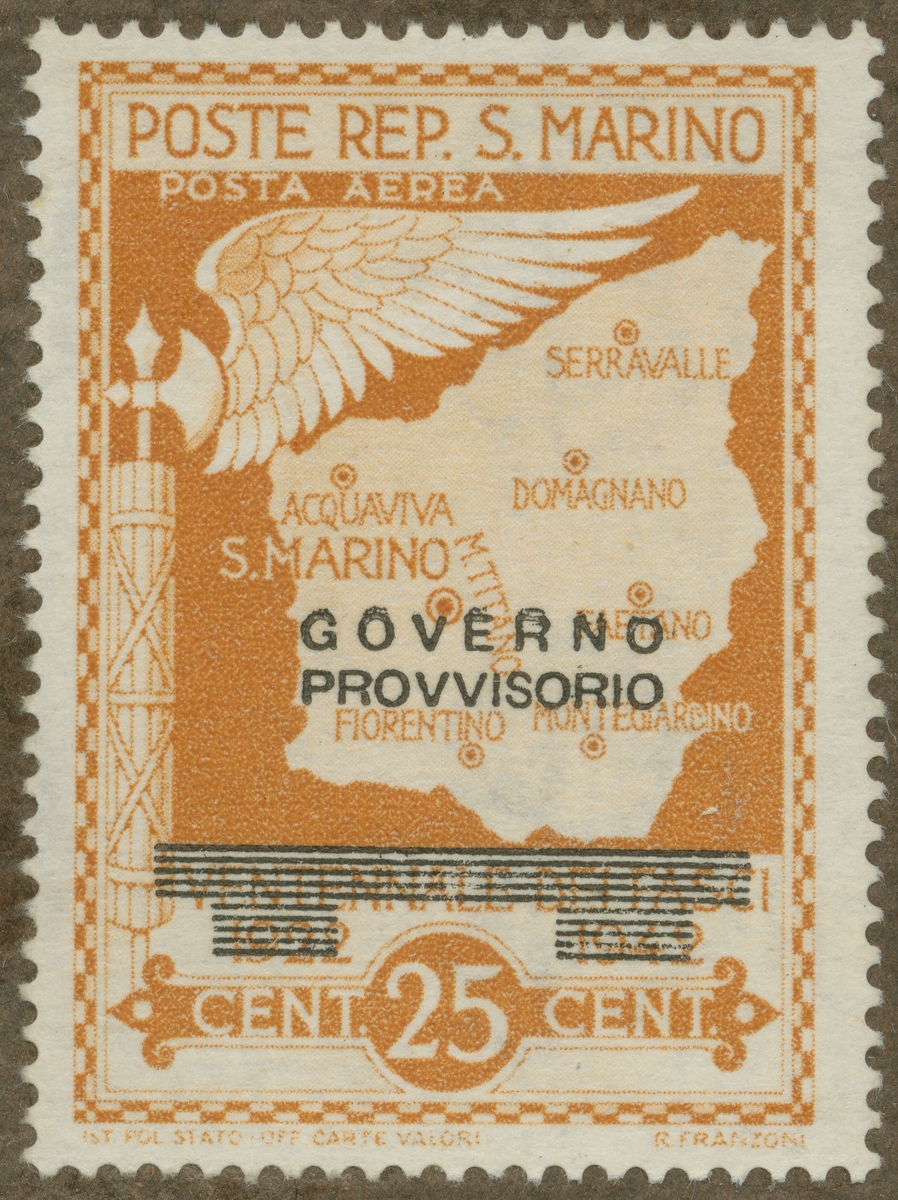 Frimärke från San Marino, 1943. Motiv av karta över San Marino. Flygsymbol. "Minne av statskuppen 28 juli 1943".