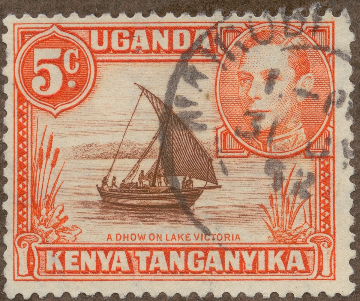 Frimärke från Kenya-Uganda-Tanganyika, 1935. Motiv av traditionell segelbåt- s.k. "dhow" på Victoriasjön i mellersta Afrika. (t.h.): Kung George VI. "-Kröningsserie-"