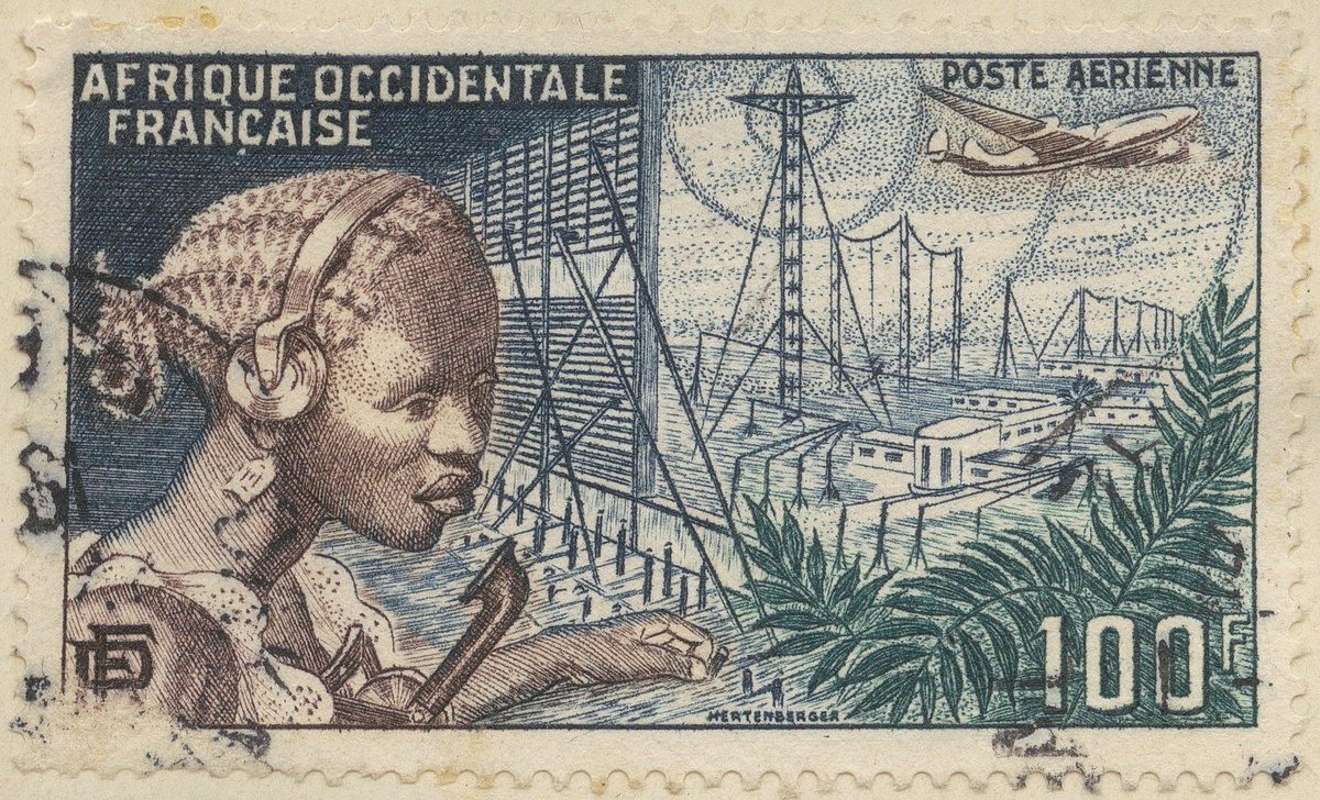 Frimärke ur Gösta Bodmans filatelistiska motivsamling, påbörjad 1950. Frimärke från Franska Väst Afrika, 1954. Motiv av telefonist