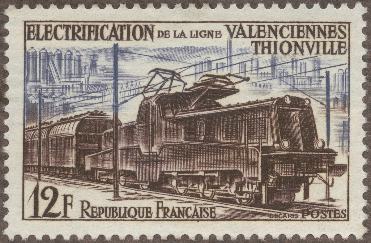 Frimärken ur Gösta Bodmans filatelistiska motivsamling, påbörjad 1950. Frimärke från Frankrike, 1955. Motiv av El-Lok "Elektrifieringen av linjen Valenciennes - Thionville"