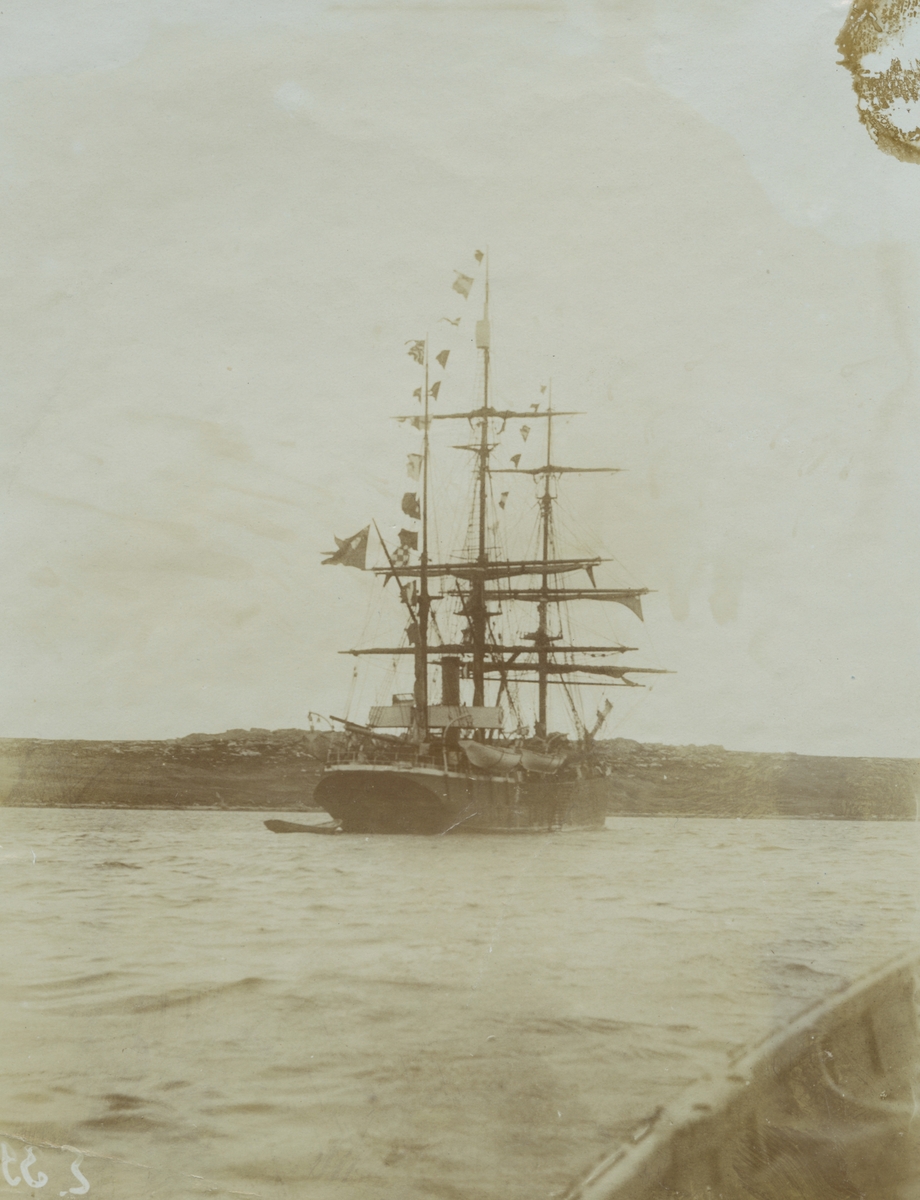 Fotografi från expedition till Grönland. Motiv av expeditionsfartyget Antarctic. Antarctic var en tremastad bark (ett segelfartyg) med ångmaskin som sjösattes 1871 och förliste 12 februari 1903.