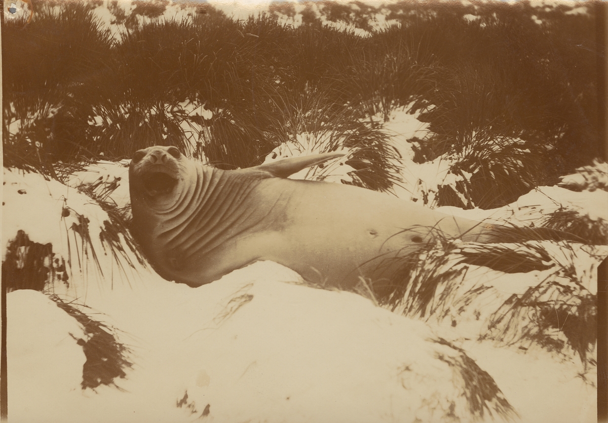 Fotografi från första svenska Antarktisexpeditionen 1901-1904. Motiv av sjöelefantsunge som ligger bland snöiga buskar i Cumberland Bay, Sydgeorgien.