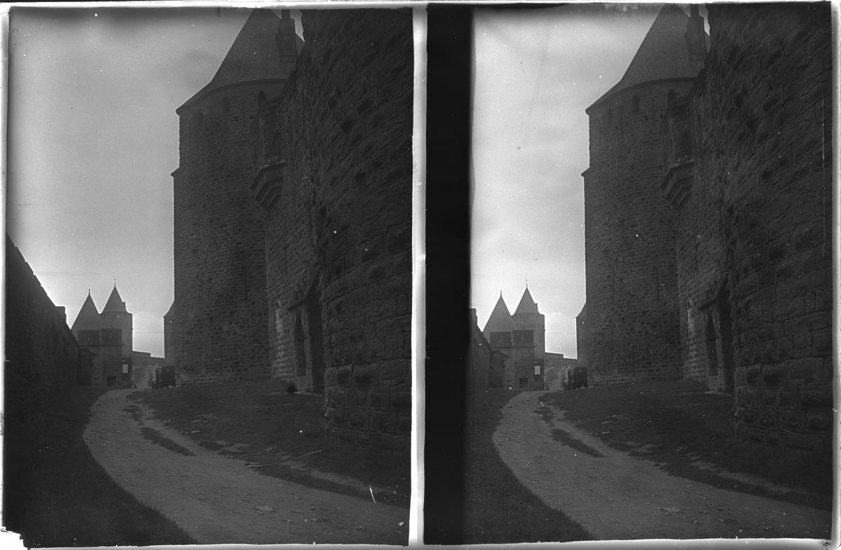 Stereonegativ, innegården vid okänd borg, okänd plats.
