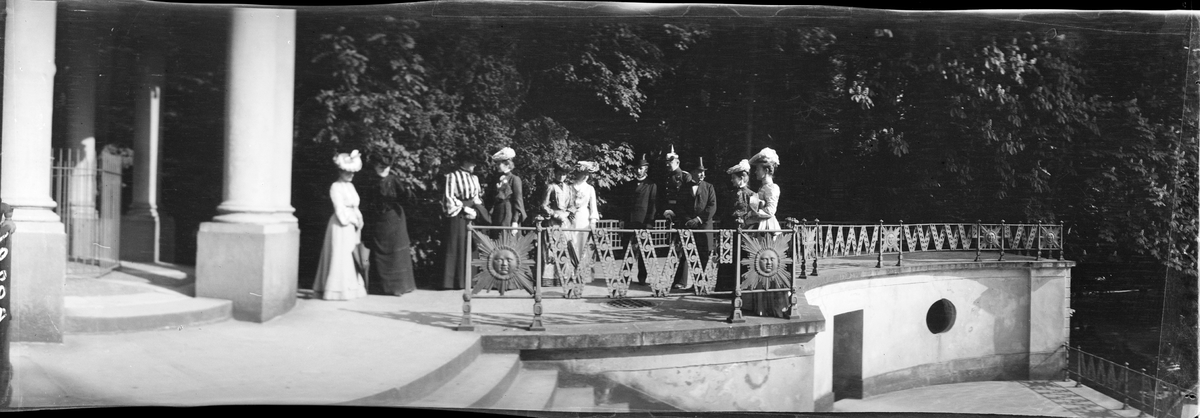 Drottning Victoria med sällskap på en altan. Troligen drottning Victoria i svart-vit randig blus.