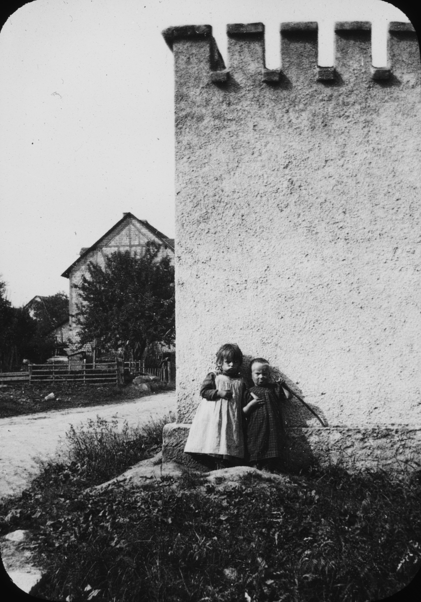 Skioptikonbild med motiv av två små flickor i Tyskland.