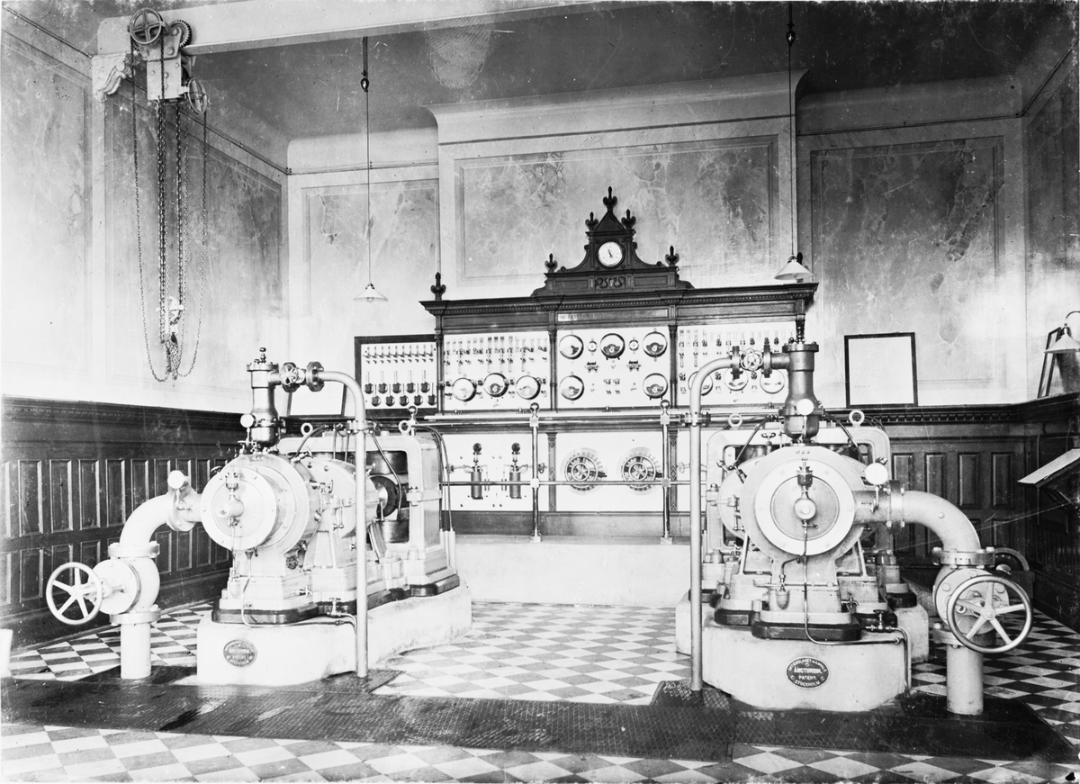 Interiör från Saltsjöbadens elektricitetsverk. Anläggningen kommer från de Lavals Ångturbin AB.