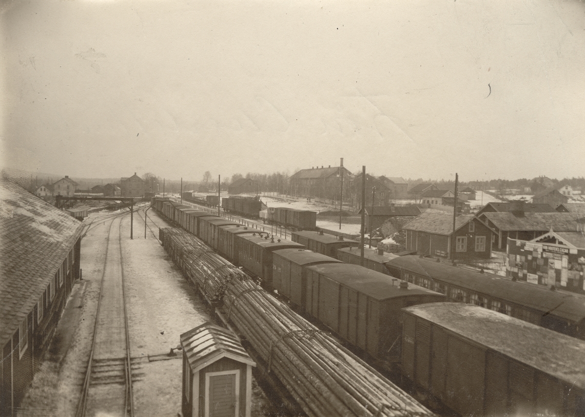 Vy över tågstation med godståg, Charlottenbergs Bruk, Värmland.