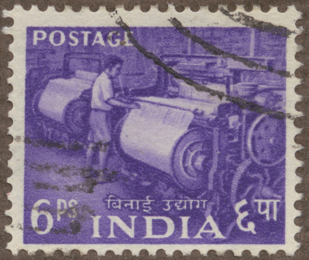 Frimärke från Indien, 1955. Motiv av maskinvävstolar.
