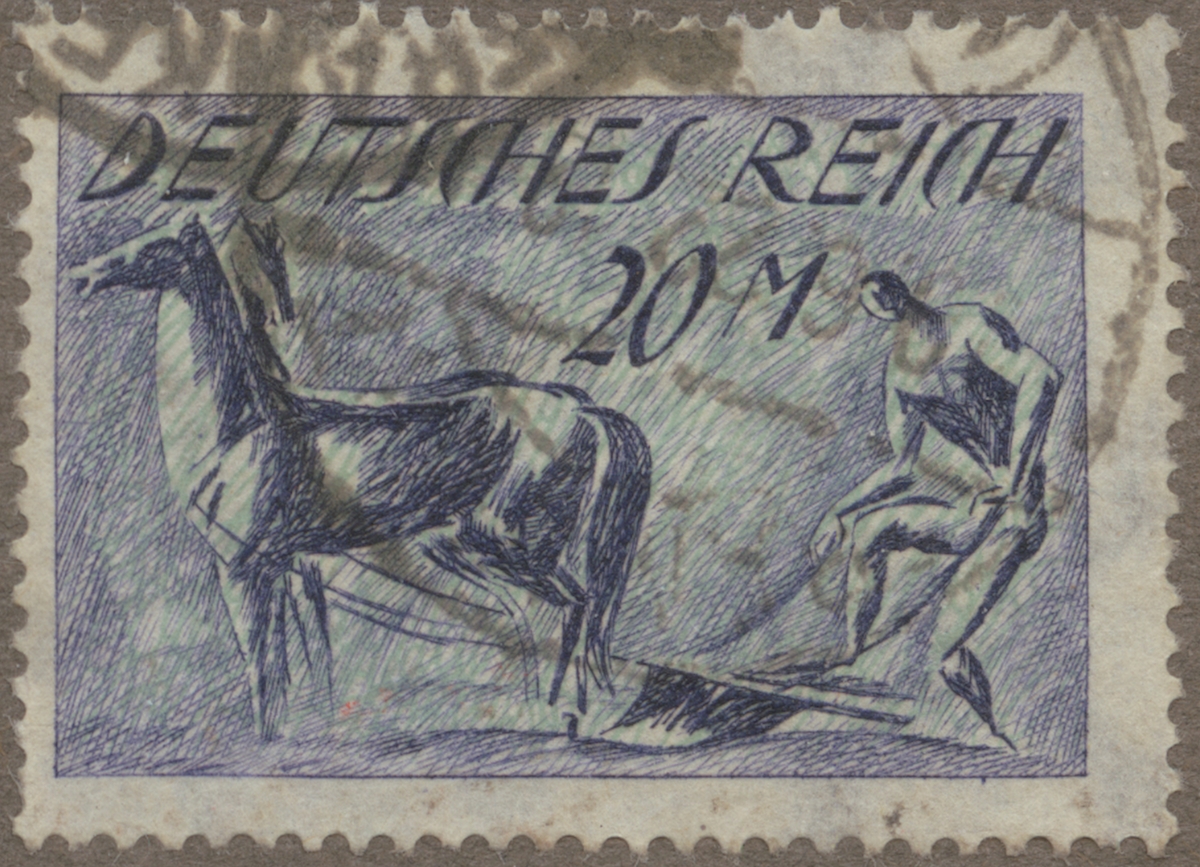 Frimärke från Tyskland, 1921. Motiv av Lantbrukare i plöjningsarbete. Häst som dragare.