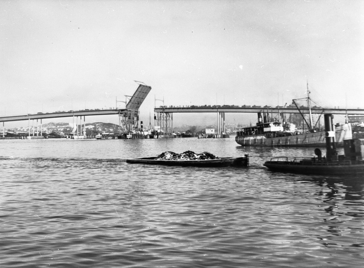Byggherre: Byggnadsaktiebolaget Contractor, Stockholm. Götaälvsbron. Vy av brodelen över älven med broöppning.