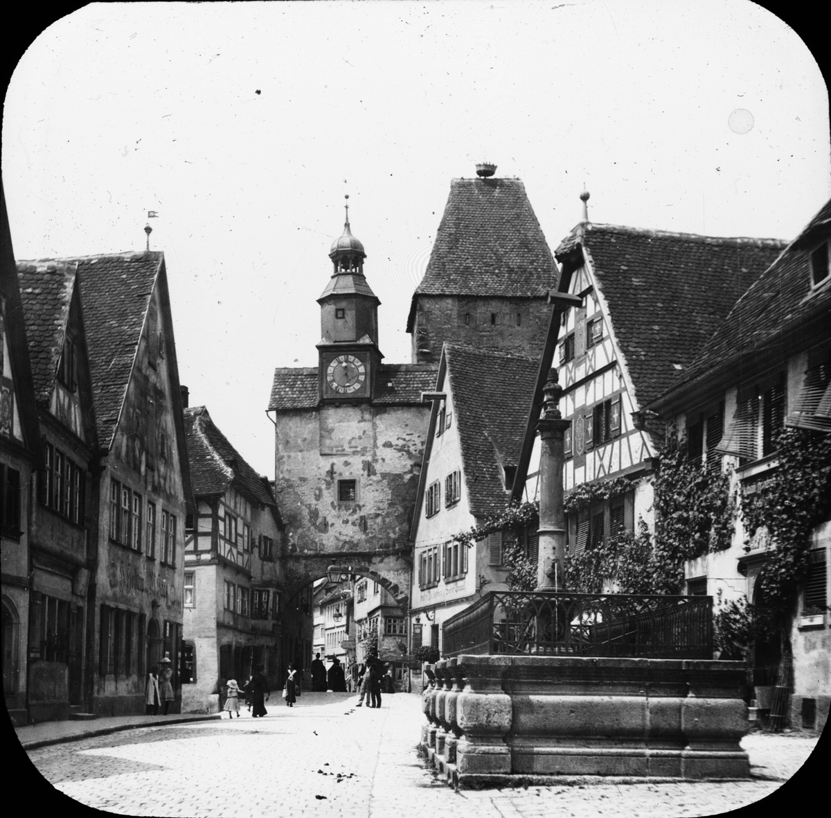 Skioptikonbild med motiv från gatan Rödergasse som passerar genom Markusturm, Rothenburg.