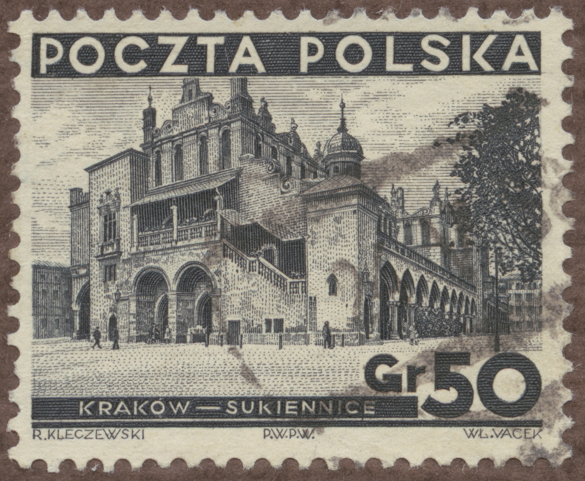 Frimärke från Polen, 1935. Motiv av tyghallen i Krakau.
