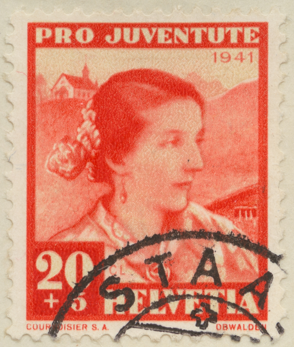 Frimärke från Schweiz, 1941. Motiv av kvinnodräkt, Obwalden.