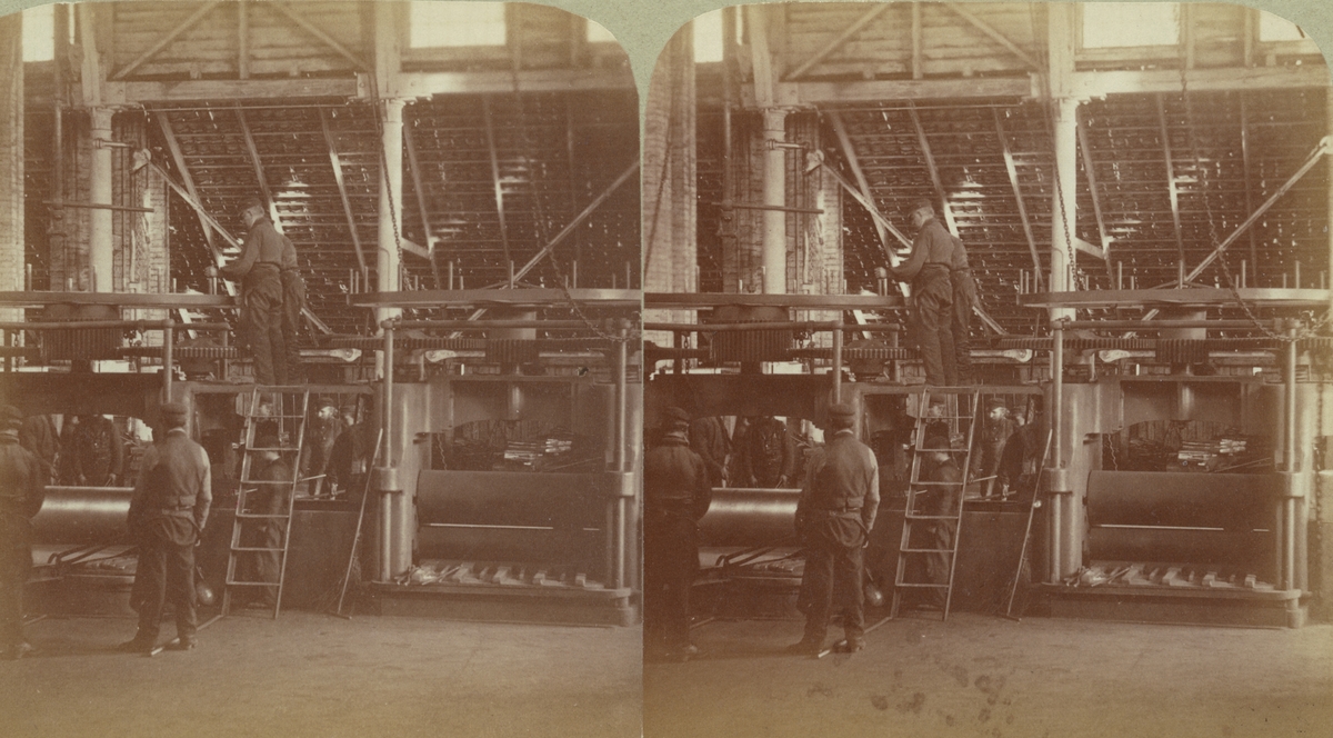 Stereobild. Motala Vekstad. Nya valsverket. Grovplåtsverket.