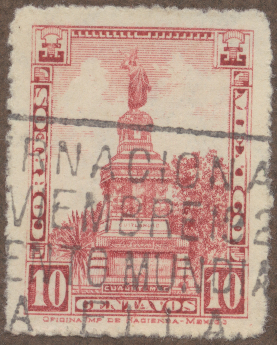 Frimärke från Mexico, 1923. Motiv av Monumentet över Cuauhtémoc i Mexiko City, aztekernas sista härskare.