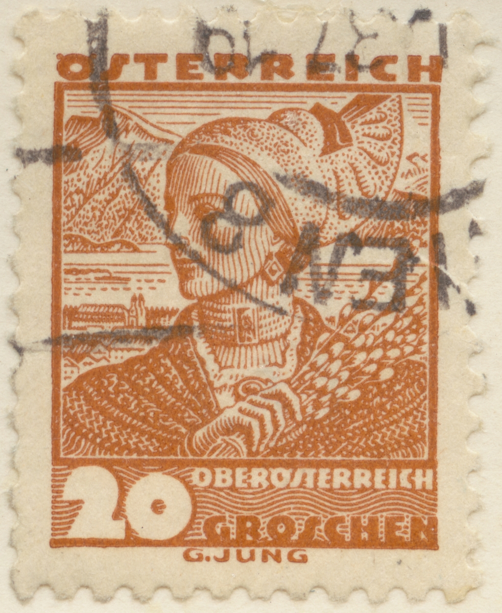 Frimärke från Österrike, 1934. Motiv av kvinnodräkt, Ober Österreich.
